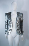 This Carolina Herrera jacket is composed of silver sequin and beaded fabric with a floral motif. Features center front hook and eye closures. The blouse has a zipper closure. In excellent vintage condition.