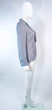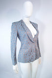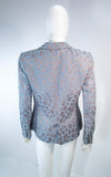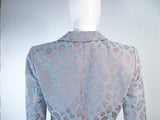 This Giorgio Armani is composed of a blue silk with a wonderful animal print. Features center front snap button closures. In excellent pre-owned condition.