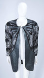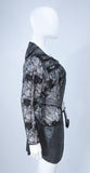 This Roberto Cavalli jacket is composed of a metallic lace and suede combination. Features a center front button closure, shoulder pads, and side pockets. There is a large jeweled belt with silver hue metal. In excellent vintage condition.